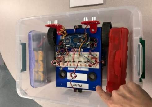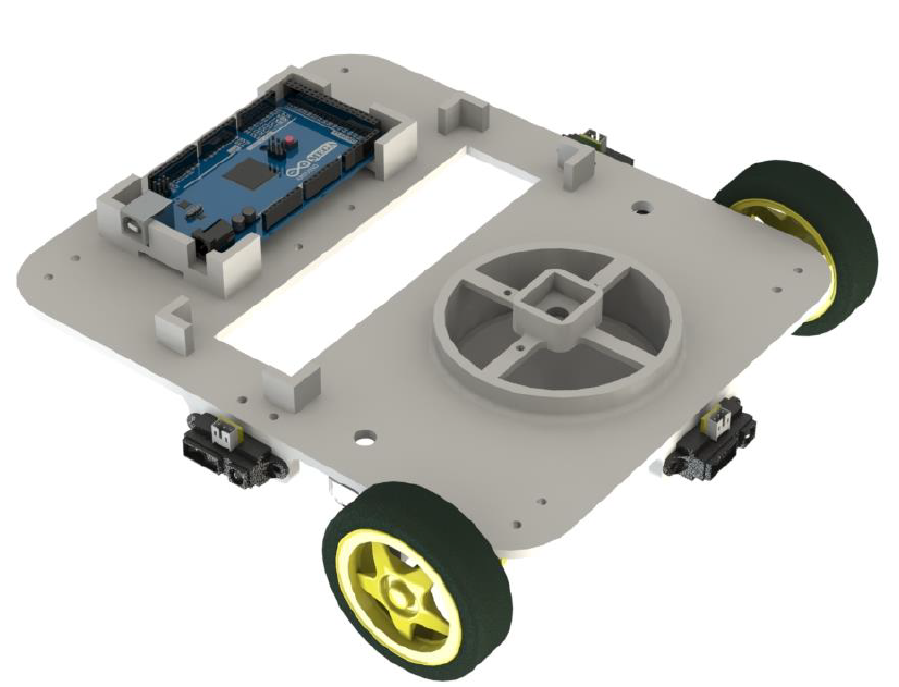 We designed the robot structure inspired by 'Cog', a mobile robot we previously worked on. The robot was programmed to wander randomly, capable of moving forward, backward, and turning to either side. Inputs to the robot were taken from Sharp GP2Y0A21YK0F IR Distance Sensor and HC SR04 Ultrasonic Distance Sensor. Outputs included controls for the Gear DC Motor and Mega 2560 Starter Kit Fan Motor, and debugging LEDs. As a rudimentary implementation of the cleaning function, we used the Fan Motor as a brush substitute.